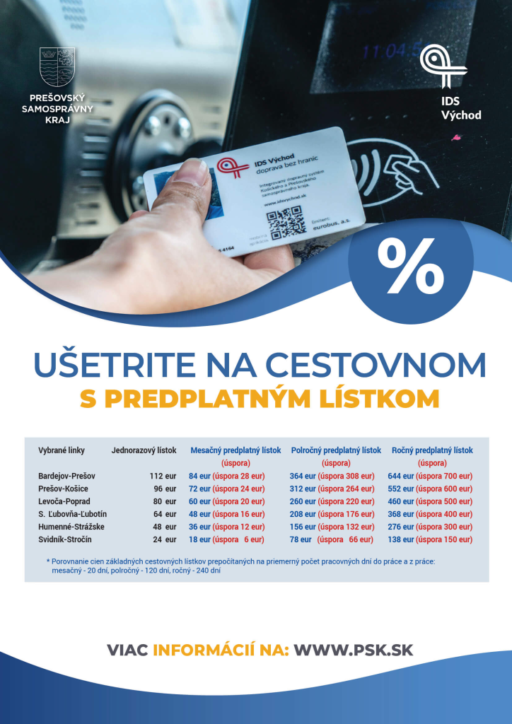 Cestujúci v regionálnej autobusovej doprave na východnom Slovensku môžu ušetriť na cestovnom desiatky, ba až stovky eur. Stačí, ak si zakúpia časový predplatný cestovný lístok. K dispozícii majú denný, mesačný, štvrťročný, polročný a ročný časový predplatný lístok na vybrané zóny.
